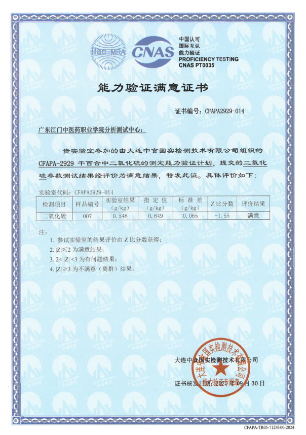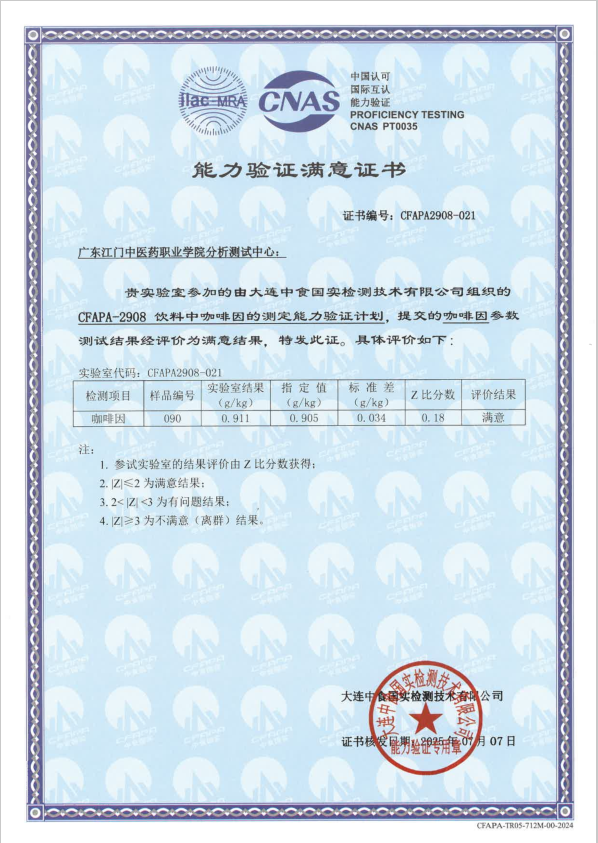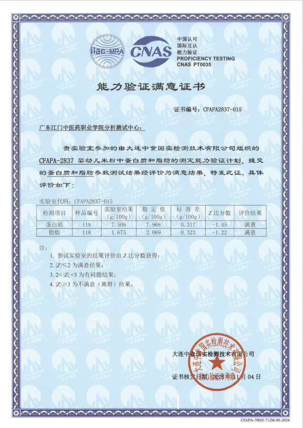 近日,我校分析测试中心取得了蛋白质和脂肪两项能力验证“满意”结果。2025年间,分析测试中心累计获得多项能力验证满意结果,主要覆盖真菌毒素、农药残留、有害元素、食品添加剂及营养成分等核心检测范畴,充分展现了中心的技术能力、严谨的科学态度以及持续追求进步的专业精神。