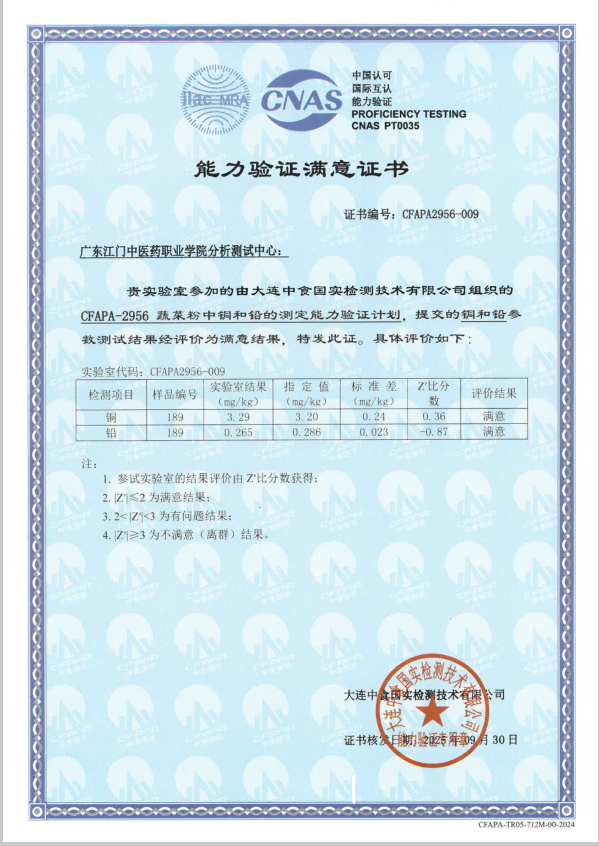 图2 蔬菜粉中铜和铅的能力验证满意证书