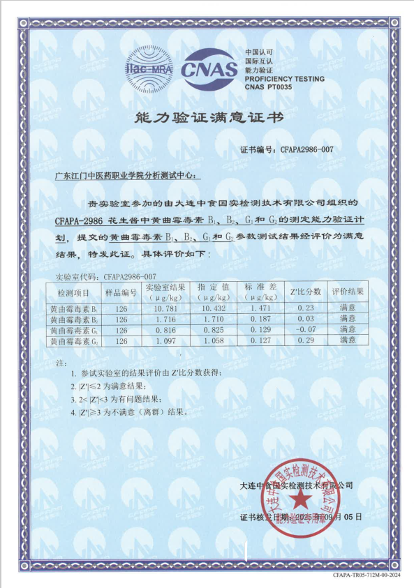 图4 花生酱中黄曲霉毒素B1、B2、G1、G2的能力验证满意证书