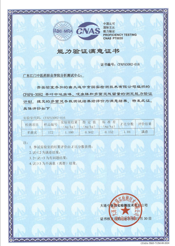 图5 茶叶中多菌灵残留的能力验证满意证书
