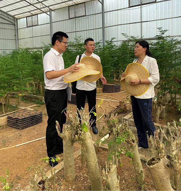 随后,调研组实地考察了水库移民主题公园,旧粮仓旅游驿站、牛山龙生态农业公司。在考察交流过程中,博士教授们结合自身专业,对该村农业产业发展纷纷建言献策,“应尽快建立规范化种植标准,提高种植技术,以提高辣木品质,打响辣木红丰品牌”、“开平地区林地多,气候环境非常适宜种植五指毛桃等林下中药材,可以适当扩大特色南药种植品种,提高林地的利用率,也提高农户的抗市场风险能力”、“校村双方应合作开展辣木叶、辣木枝、辣木籽的活性成分的研究,开发有自主知识产权的辣木深加工产品,避免市场的同质化现象”、“学校可以对辣木产品农残、重金属等有害物质进行检测分析,为产品安全性背书”。