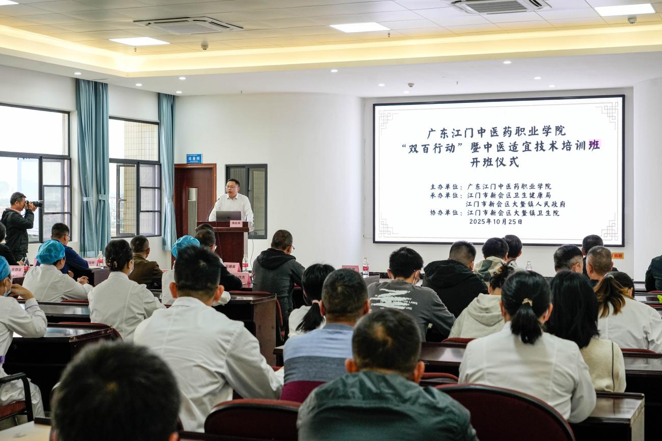 学校党委书记蒋业洲在致辞中表示,广东江门中医药职业学院作为中医药人才培养的重要阵地,始终秉持“传承国粹、守正创新”的理念,把服务基层作为学校的重要使命,构建了“校地联动、医教协同”的基层中医药服务体系,创新模式为基层培养中医药实用型人才。他强调,当前省委“1310”具体部署与“百千万工程”“双百行动”正深入推进,提升基层中医药服务能力、推广中医适宜技术既是响应国家中医药发展战略的必然要求,也是满足群众需求的利民之举,关系群众健康福祉。学校紧扣基层临床需求,集结专家教师队伍、精心设计课程,力求理论与实操并重、根基与技能共固,力求让每一位学员听得懂、学得会、带得走、用得上,真正实现学有所获、学以致用,让中医适宜技术在基层落地生根、开花结果。