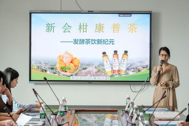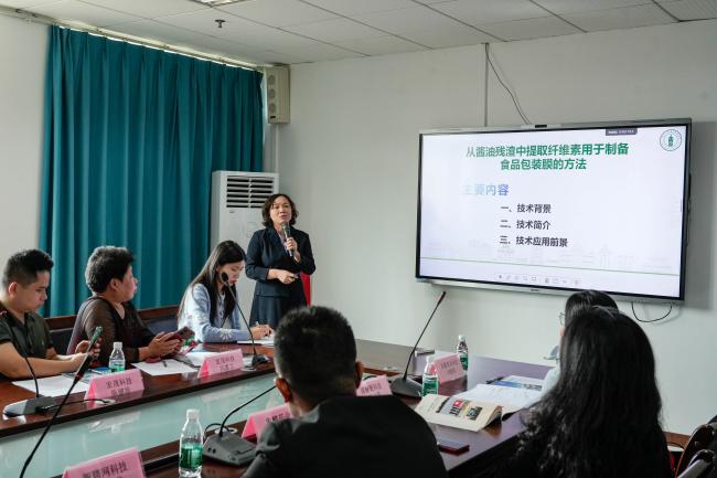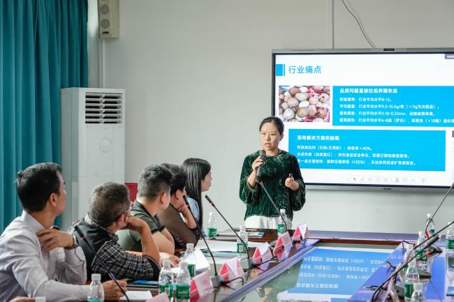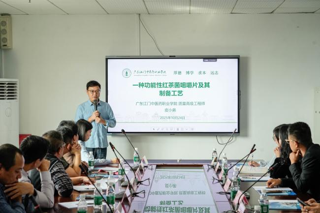 我校7个项目负责人依次登场,围绕产品开发、技术发明与工艺改进等方面,展示了多项创新成果。内容涵盖多个应用领域,包括杜阮凉瓜面膜、新会柑康普茶、可提取挥发油的煎药装置、红茶菌咀嚼片、提高鹌鹑蛋品质的饲料添加剂、酱油残渣制备食品包装膜的方法、药材渗漉装置。