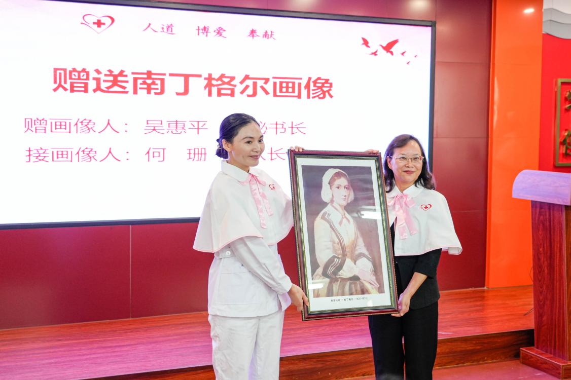 在庄重的授旗与赠画像仪式中,吴惠平副秘书长将象征着责任、使命与荣耀的志愿护理服务队队旗授予队长谭晓玉,将南丁格尔女士的画像赠予副队长何珊。