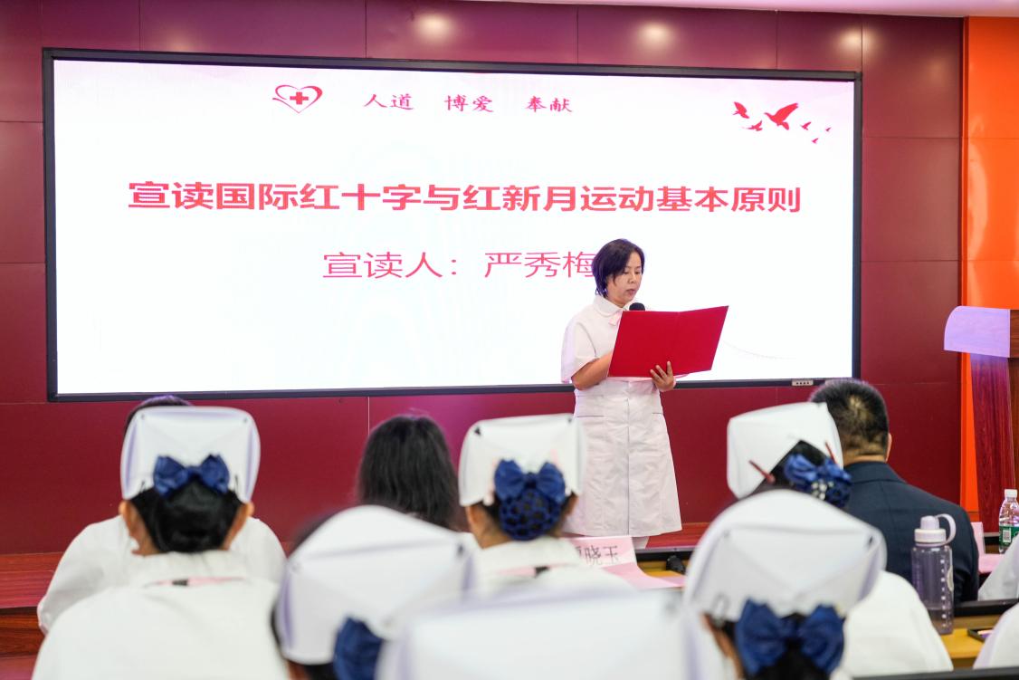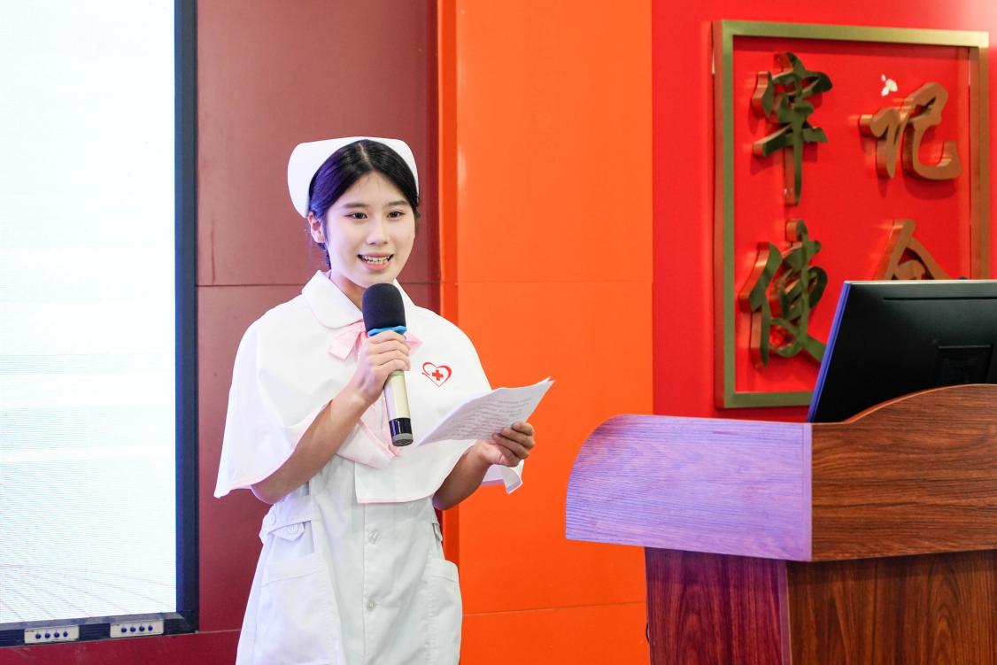 护理学院严秀梅副院长宣读《国际红十字与红新月运动基本原则》,志愿者代表丘小慧结合自身参与志愿服务的经历,分享了对于南丁格尔精神的理解与感悟,号召全体志愿者努力成为南丁格尔精神的优秀传播者和实践者。