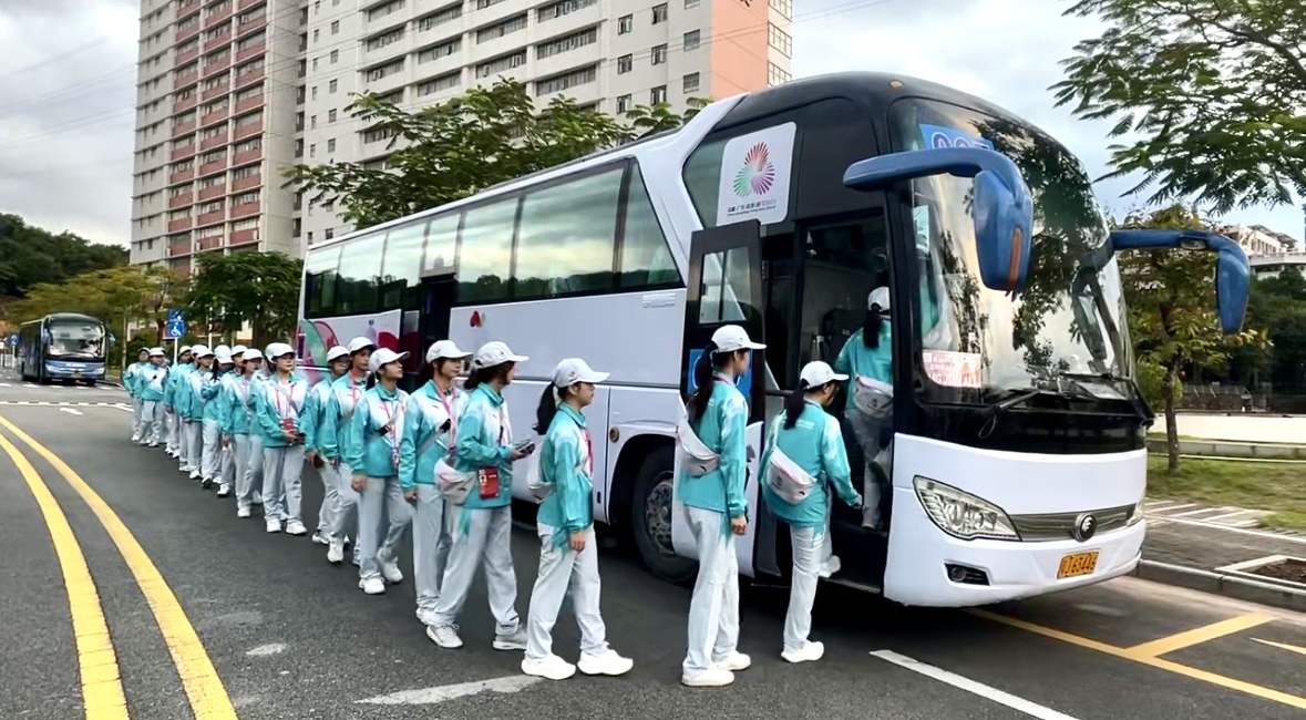 激情全运会,活力大湾区,11月13日第十五届全国运动会花样游泳赛事在江门体育中心游泳馆正式拉开帷幕。广东江门中医药职业学院277名“小海豚”志愿者乘坐组委会的接送大巴,于7时准时抵达场馆,整装投身到赛事志愿服务中。