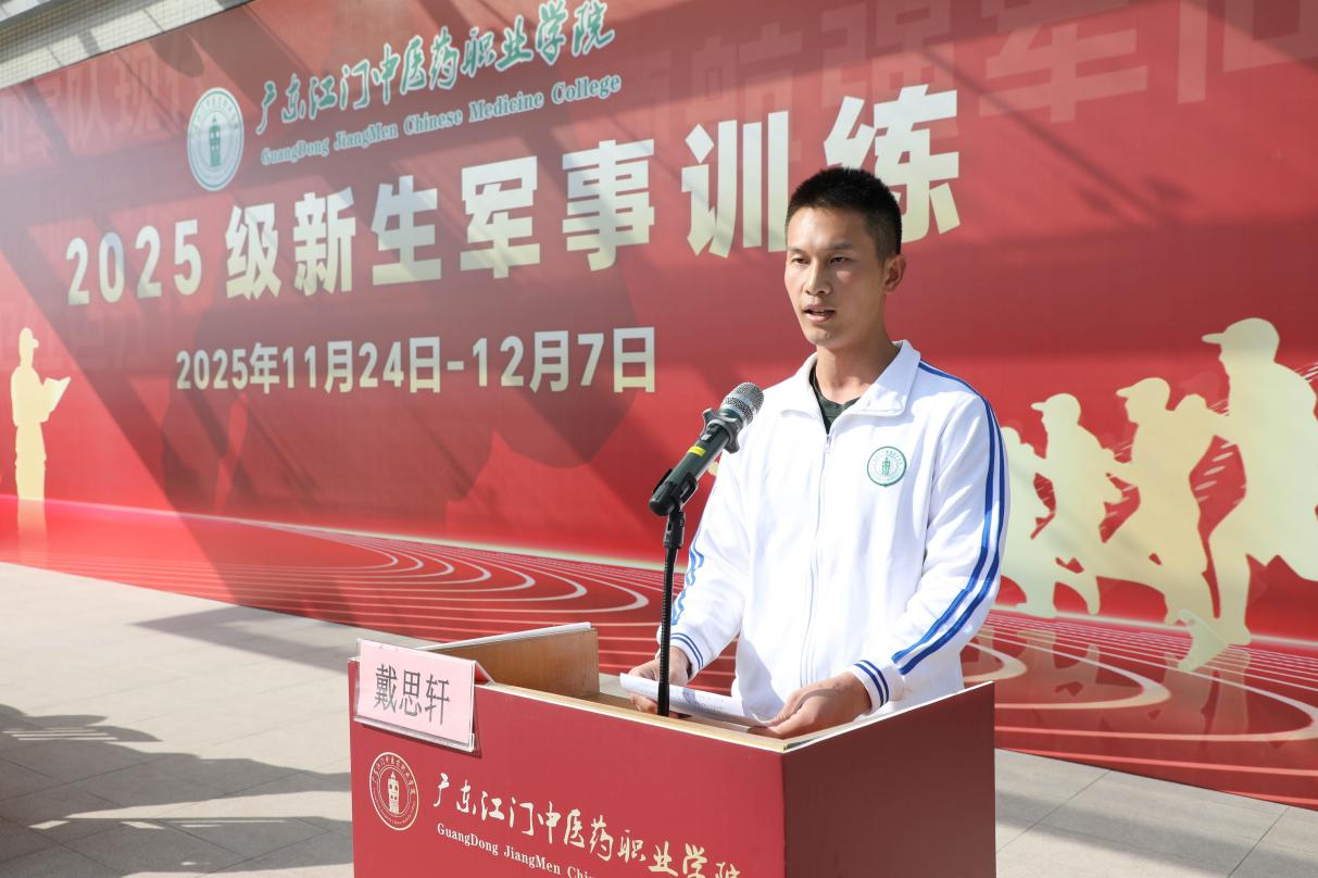 针灸推拿25(1)班戴思轩作为学生代表发言。戴同学指出选择医学即担守护之责,与军人担当一脉相承。军训是医学生涯的重要“预备课”和“基础课”,锤炼意志、纪律与体魄。愿我们以军人标准严要求,砺练品格,为未来行医之路筑牢根基,不负青春与使命!
