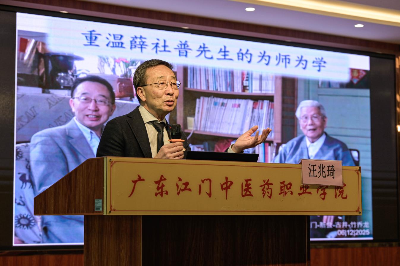 侨乡金风传雅韵,杏坛盛会聚贤英。2025年12月6日下午,由中共江门市委统一战线工作部、江门市新会区人民政府、政协江门市委员会办公室联合主办,民盟江门市委会、江门市科协、江门市侨联、新会区政协、广东江门中医药职业学院、江门市中心医院共同协办的“侨乡杏林颂风骨 科学精神照前路——弘扬薛社普院士科学家精神宣讲会”在广东江门中医药职业学院学术报告厅举行。薛社普院士家属代表、学生代表,专家学者,市、区有关部门单位和医疗机构相关负责同志,以及广东江门中医药职业学院师生代表齐聚一堂,共同参与这一科学与人文交融的精神盛会。活动由广东江门中医药职业学院党委副书记、校长程文海主持。