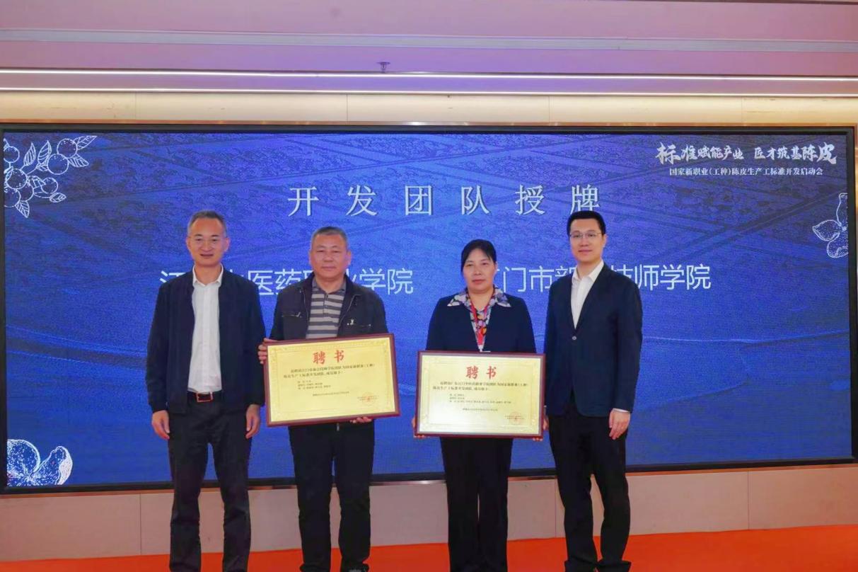 近日,国家新职业(工种)“陈皮生产工”标准开发启动会在“中国陈皮之乡”广东江门新会召开,标志着全国陈皮产业从此拥有专属职业类别,为陈皮全产业链的人才培养与评价提供了科学依据,是传统特色农业迈向标准化、专业化发展的重要里程碑。作为标准主要起草单位,我校以深厚的专业积淀和主动的担当精神,深度参与了这一从0到1的开拓性工作,学校团队获颁 “国家新职业(工种)陈皮生产工标准开发团队” 聘书,2位专家受聘为 “标准开发核心专家”。