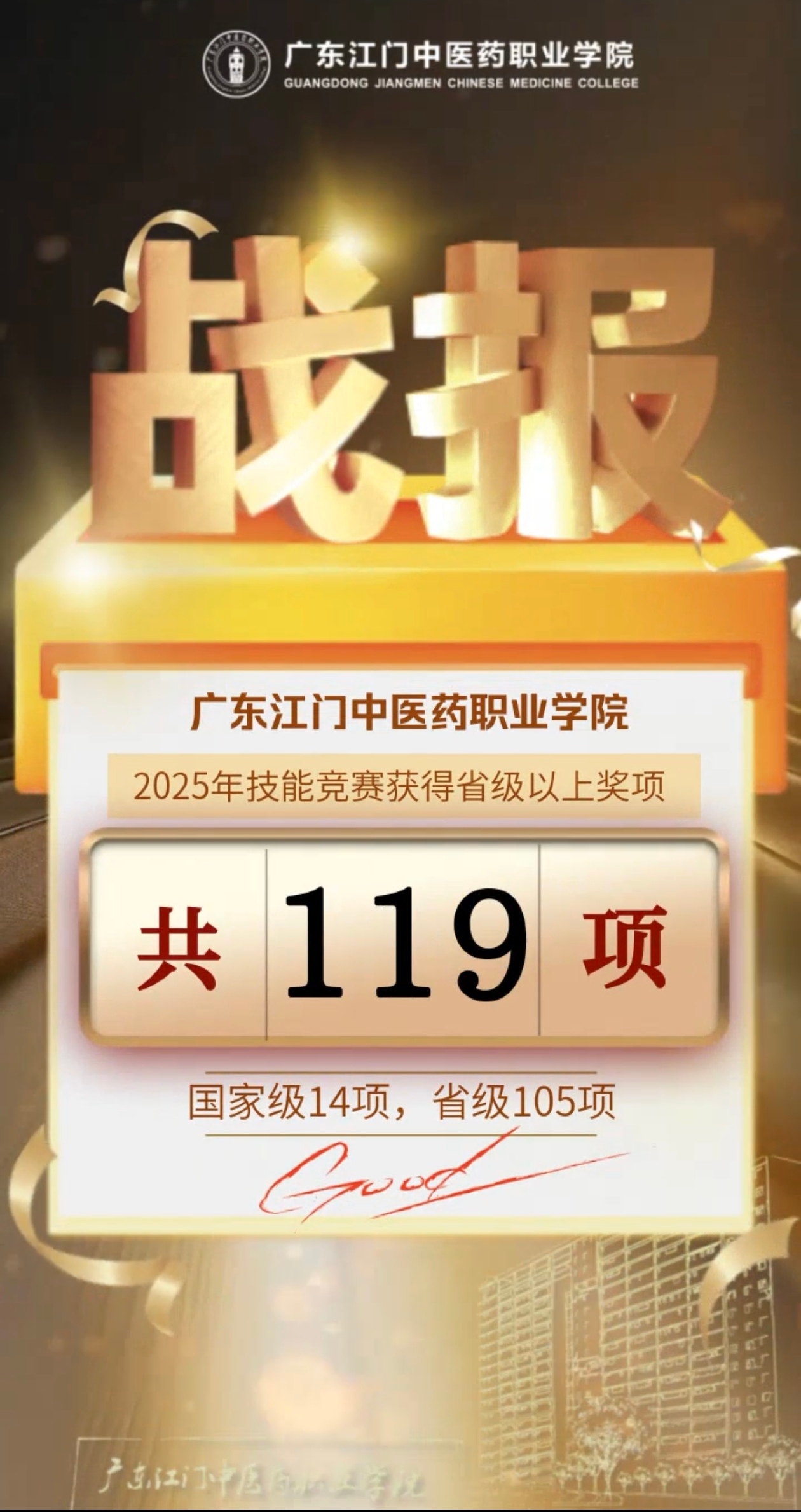 从国内技能竞赛的全面突破到世界赛场的精彩亮相,119项沉甸甸的奖项,是江门中医药职业学院坚守为党育人、为国育才初心,深入贯彻国家职业教育方针政策交出的生动答卷。学校分管教学的副校长表示,“学校将继续秉持立德树人根本任务,持续深化产教融合、赛教结合,强化技术技能人才培养,让更多德技兼修、知行合一的高素质中医药技术技能人才脱颖而出,为粤港澳大湾区健康产业发展和中医药事业传承创新贡献坚实力量”。