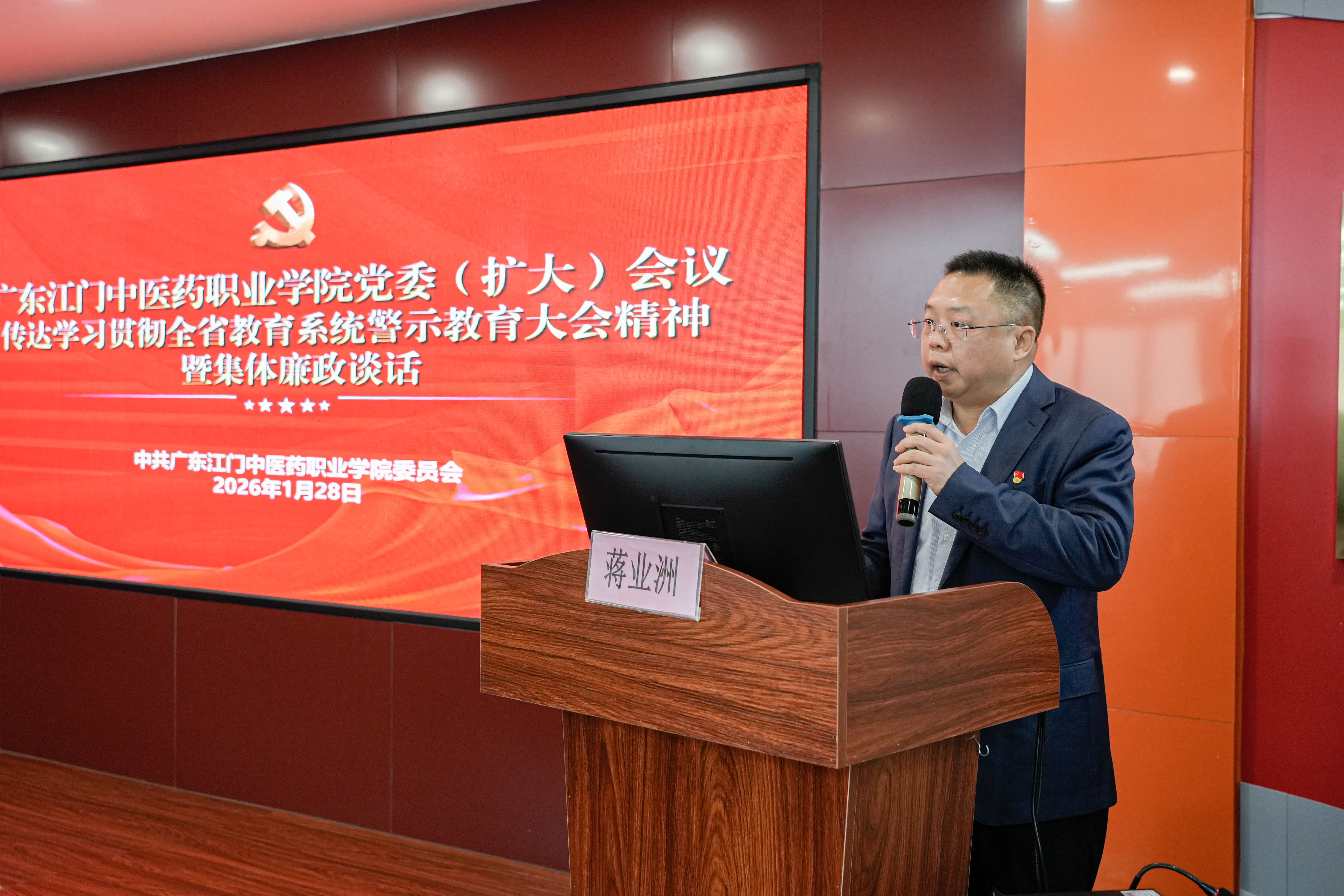 会议传达学习全省教育系统警示教育大会精神,开展集体廉政谈话。蒋业洲书记结合教育系统近年违纪违法典型案例,深入剖析问题根源与深刻教训,强调全面从严治党永远在路上,党风廉政建设必须常抓不懈,全校上下要以案为鉴、警钟长鸣,严守纪律规矩底线。