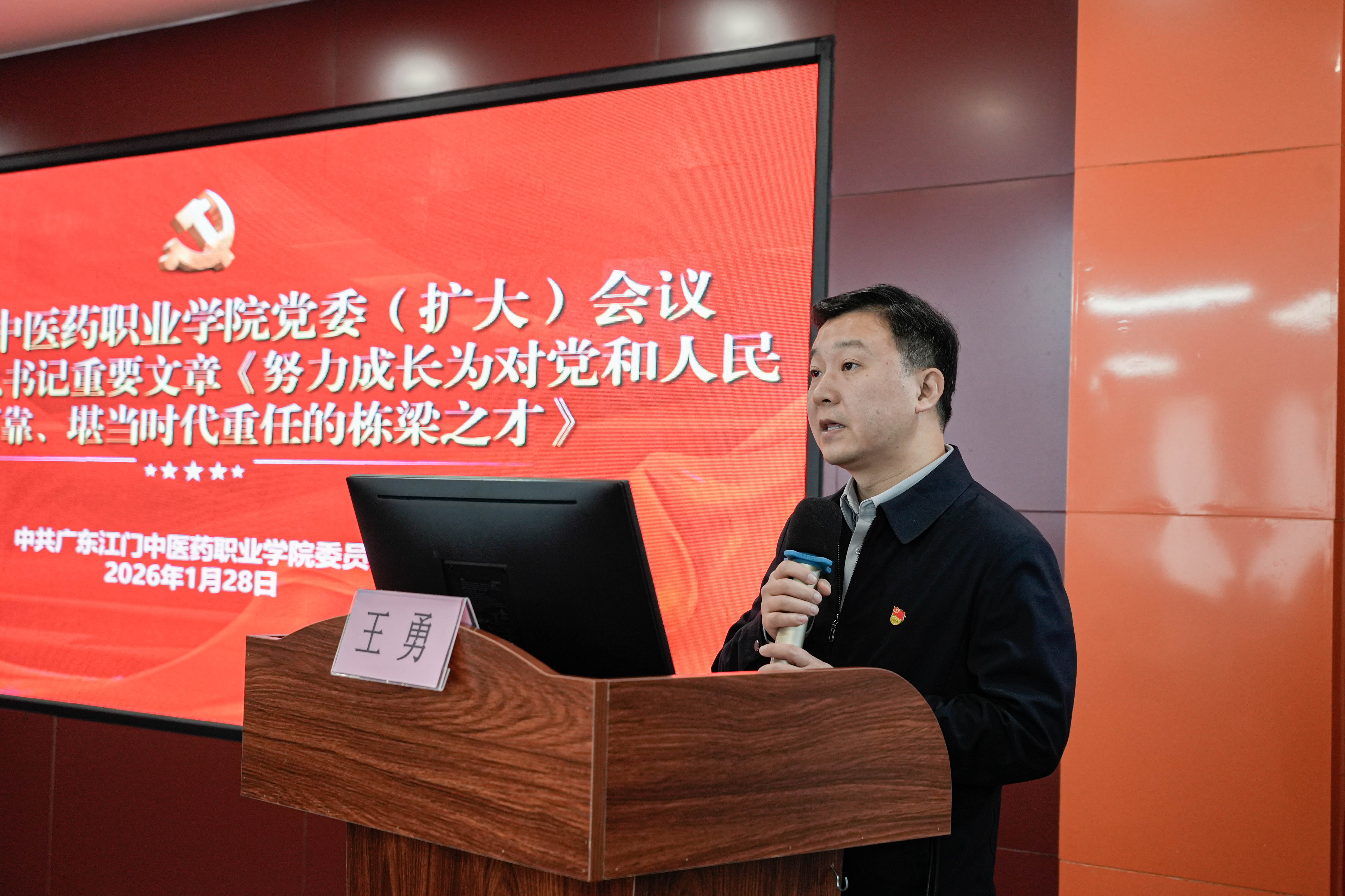 会议集中学习江门发布1月23日转载的习近平总书记重要文章《努力成长为对党和人民忠诚可靠、堪当时代重任的栋梁之才》。校党委书记蒋业洲在领学中指出,这篇重要文章系统阐释了新时代干部健康成长的根本遵循与实践路径,为学校加强干部队伍建设、推动中医药教育高质量发展提供了重要指引。