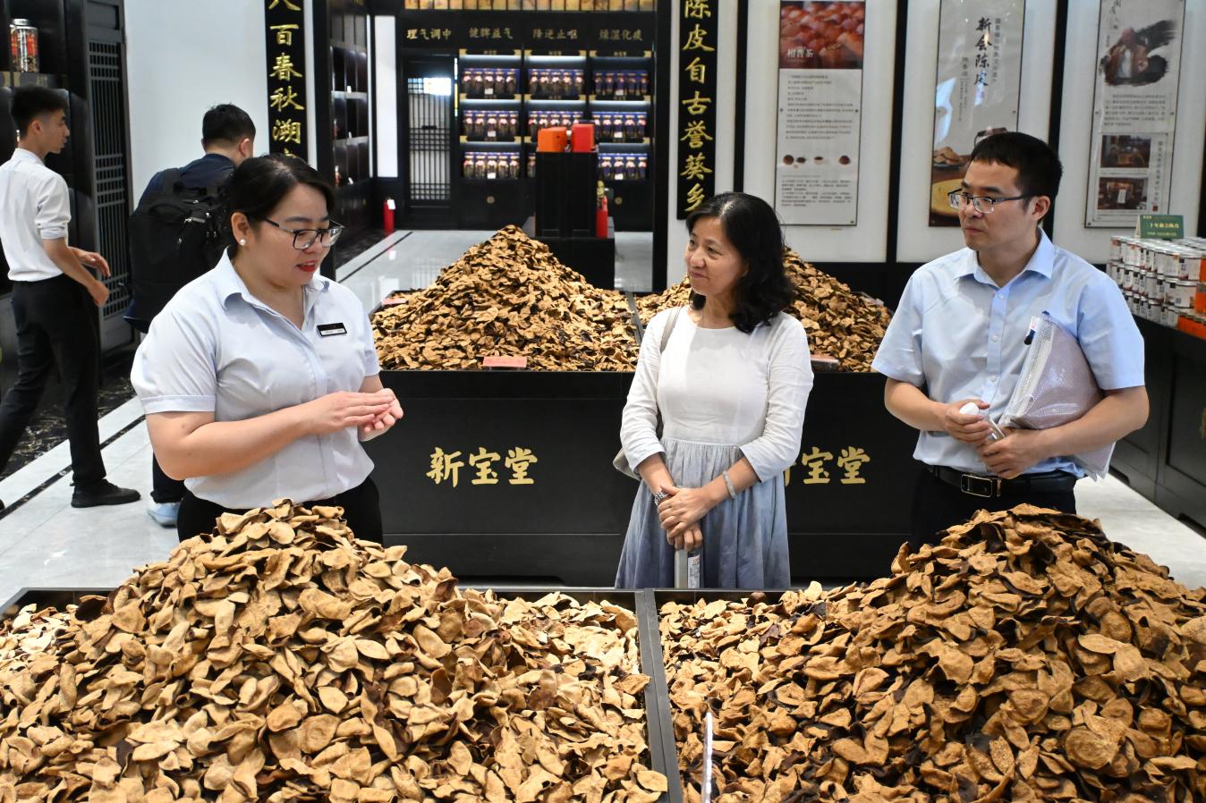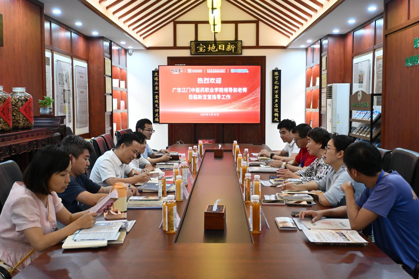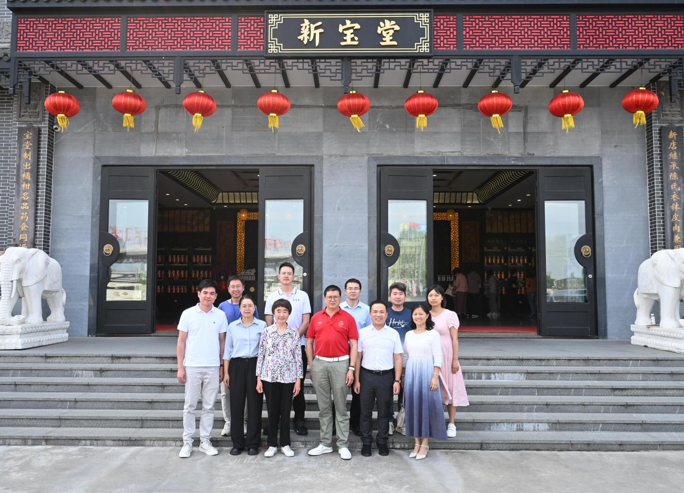 新宝堂集团总经理杜朝嵚、研发中心总经理尹建云、生物公司副总经理区欣媚、研发部总监李维龙、生产总监伦卓峰、质量总监黄锦华等负责人热情接待,双方围绕新会陈皮产品深度开发、柑果肉资源化利用、零添加健康食品研发、科技成果转化等主题展开深入探讨。