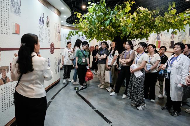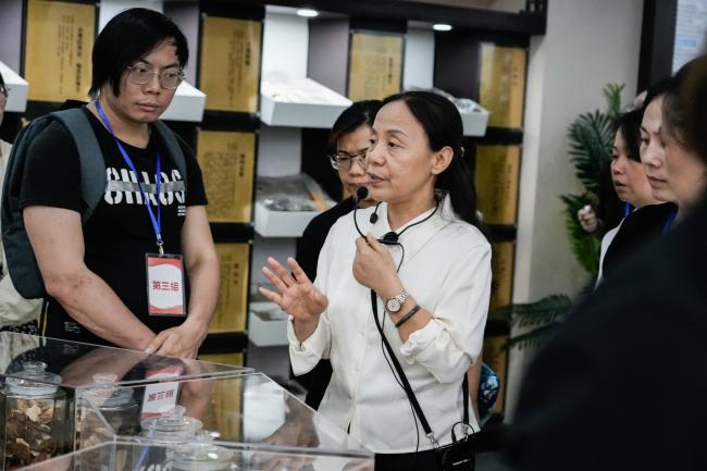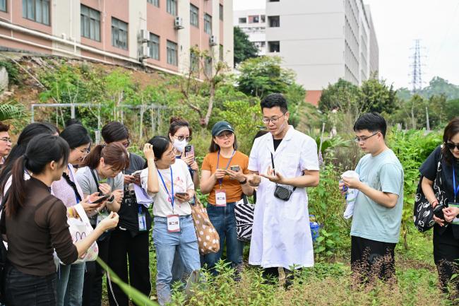 岭南药用植物园内,草木葱茏、药香萦绕,谭晓玉副校长与学员们一起循着草木踪迹,辨识栀子、广藿香等岭南道地药材,在触摸枝叶、辨识性味间,体悟 “神农尝百草” 的探索精神,感受岭南中医药的地域特色与自然禀赋。中医药展览馆里,药韵悠长,串联起中医药发展的千年脉络,学子们驻足观摩、交流探讨,在古今对话中读懂中医药文化的深厚底蕴。