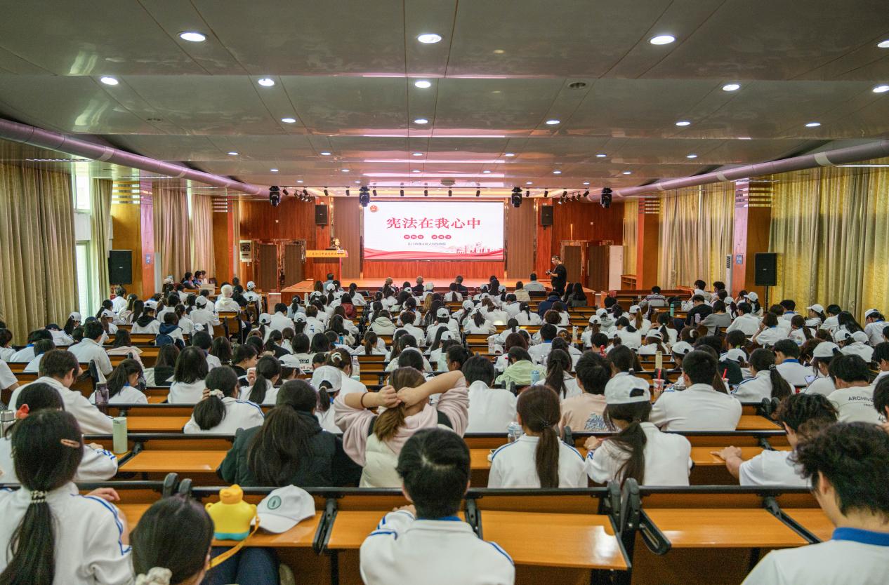 在2025年全国宪法宣传周(12月1日至7日)期间,为深入学习宣传贯彻习近平法治思想,落实“宪法宣传周,推动宪法深入人心”的工作要求,我校在12月3日下午16时在学术报告厅举办宪法专题讲座,为全校师生送上生动的法治盛宴。江门市蓬江区人民检察院党组书记、检察长、我校法治副校长苏劲光同志、副检察长黎杏瑜同志、第五检察部副主任甄祖敏同志、学校党委书记蒋业洲同志、副校长欧阳能同志、保卫部、学工部相关同志以及学生代表400多人现场参加了此次讲座。另外通过录播的方式,覆盖全校4000多名学生。