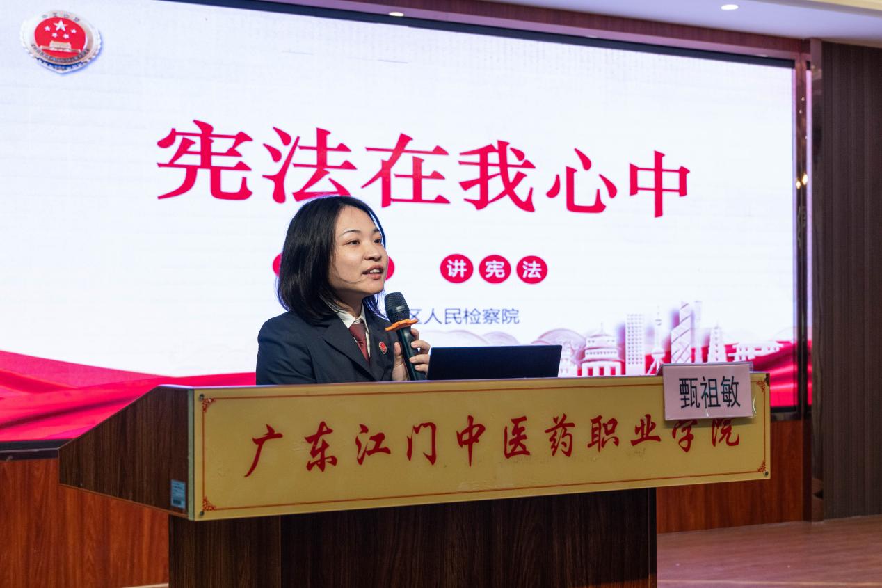 本次讲座由市蓬江区人民检察院第五检察部副主任甄祖敏同志主讲,以“法条+案例”的形式,系统阐释了宪法作为国家根本法的地位与作用,深入解读公民基本权利与义务的宪法规定,勉励我校学生要积极培养法治观念,增强法律素质,希望同学们要学法、懂法,守法、用法,做文明守法的好公民,讲座过程还设置互动问答环节,现场氛围热烈。